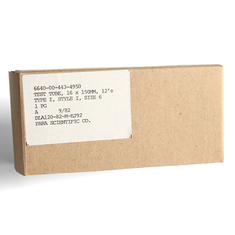 制式名称:TEST TUBE,16×150MM,12's TYPE 1, STYLE 1,SIZE 6 米軍実物放出の試験管です。