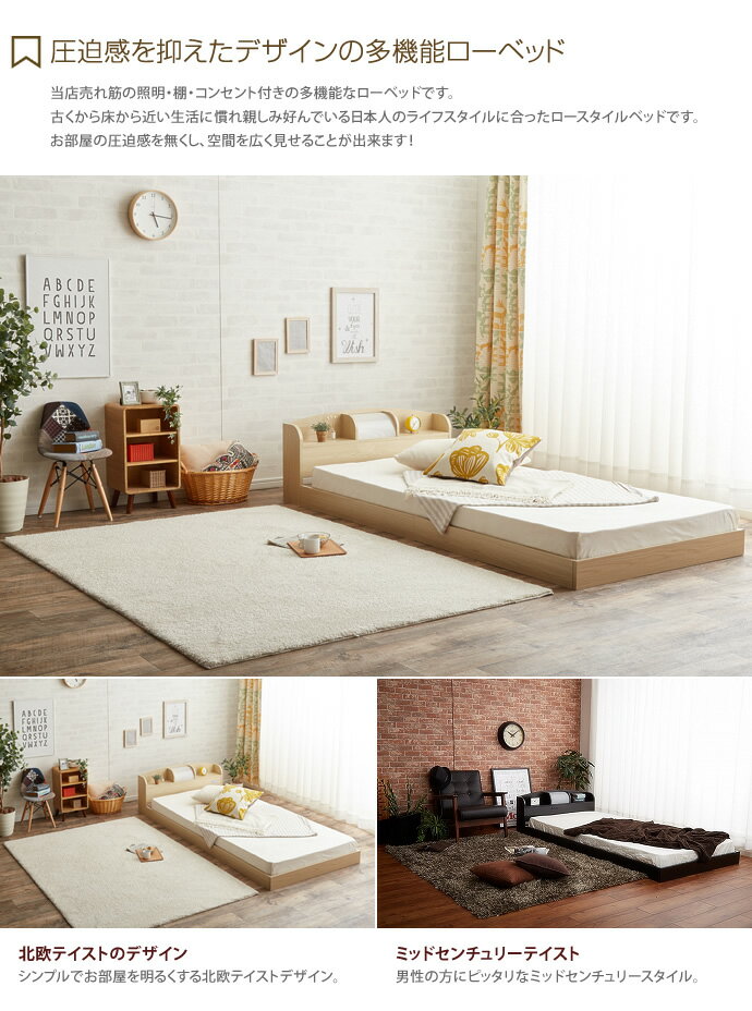 【セミダブル】【超高密度ポケットコイルマットレス付】 ライト付きローベッド[フロアベッド] Modern Light