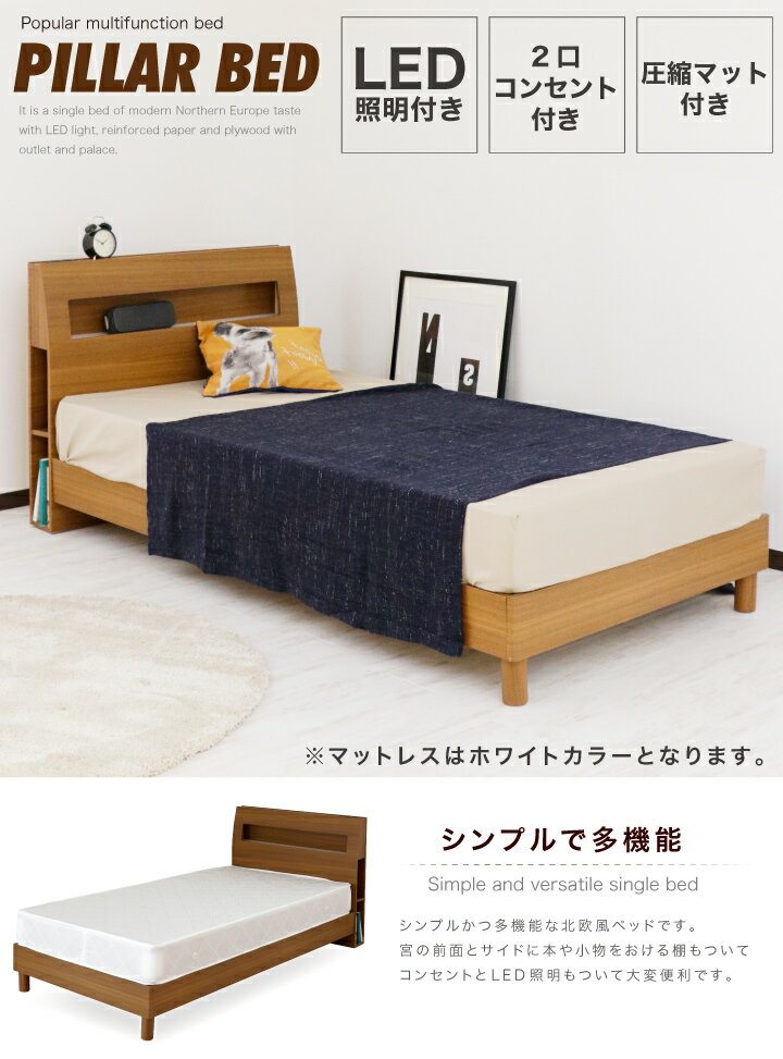 LEDライトと2口コンセント付き 材質 MDF/プリント紙 【圧縮マットレス】 外装生地:ポリエステル100% 本体:ポケットコイルスプリング 詰め物:ウレタンフォーム、不織布、硬質綿、フェルト) サイズ ベッド:幅122×長さ213×高さ84(床面高さ23)cm マットレス:幅120×長さ195×厚み20cm カラー ベッド:ブラウン マットレス:ホワイト 特徴 輸入品 お客様組み立て品 2口コンセント付き 棚付き LED付き マットレスは圧縮のため復元率(サイズ)に若干の誤差があります 圧縮マットレス付き ■画像のカラーについて お持ちのパソコンによって商品の色が実際の商品と異なって見えてしまう場合がございます。